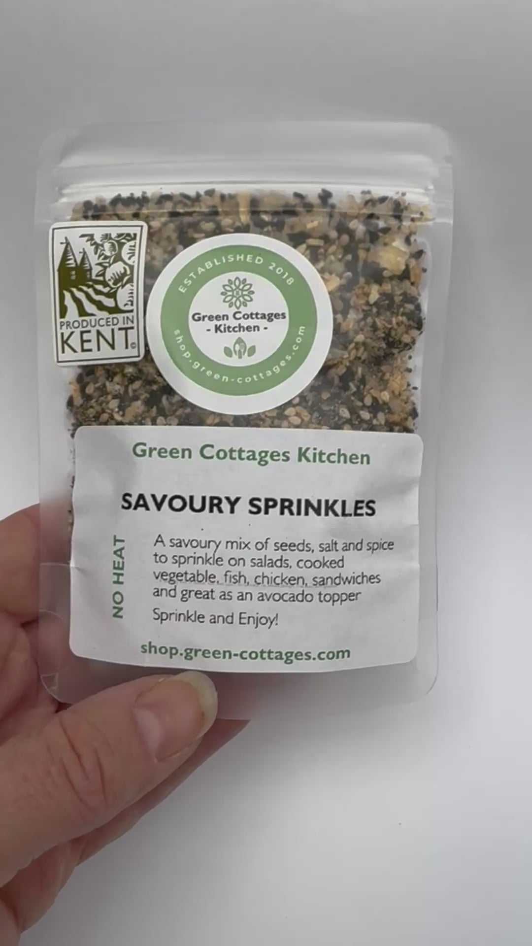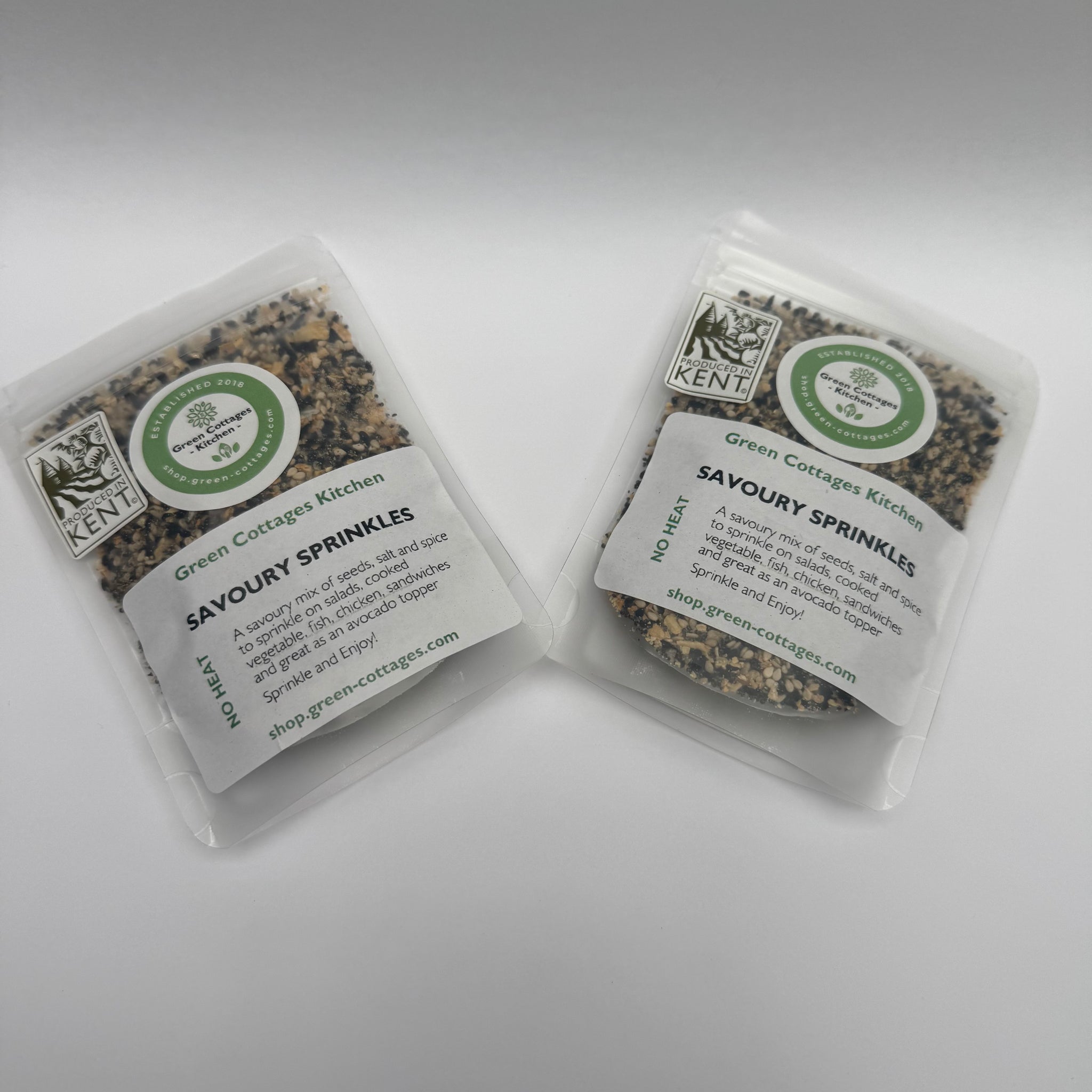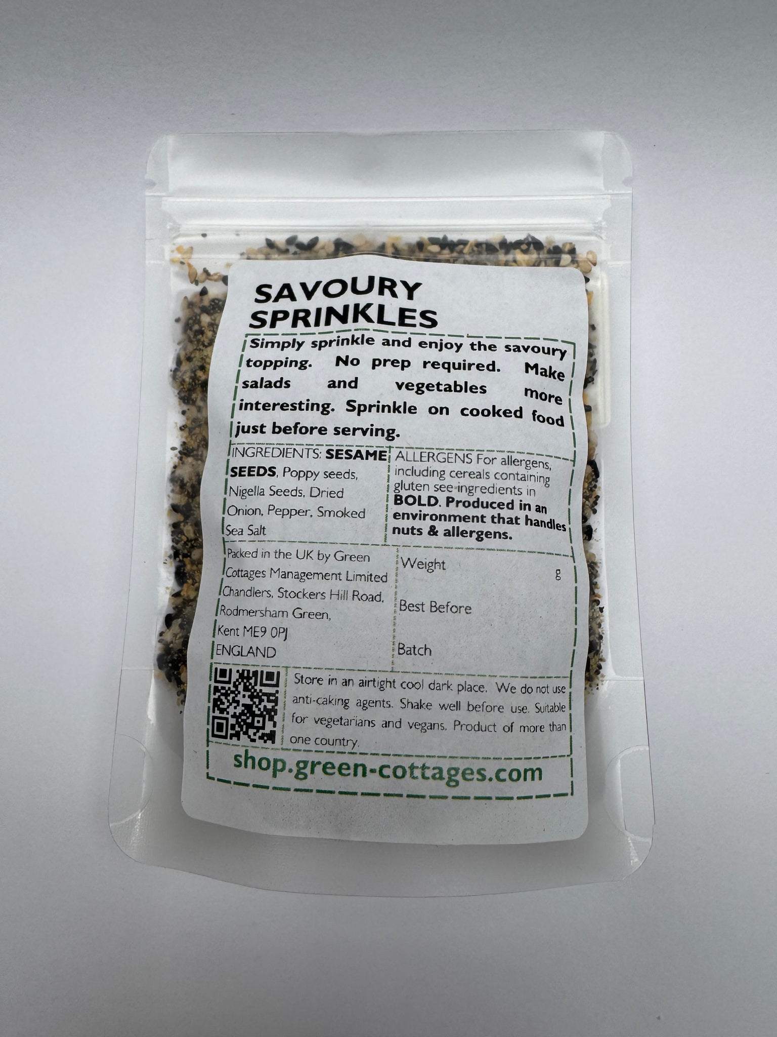 * Savoury Sprinkles is a seasoning that can be used as a condiment or sprinkle, made with sesame seeds, nigella seeds, poppy seeds and selected spices including onion, cracked black pepper and smoked sea salt. An authentic hand blended premium spice, prepared by us at Green Cottages Kitchen, in Kent.